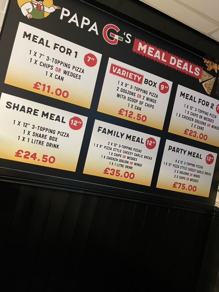 Papa G’s Pizza in Omagh offers a wide array of delicious options perfect for any craving. Popular dishes include the New Chicken Curry & Chips, with tasty chicken curry served alongside crispy chips. For those looking to save, there are several special offers, like Offer 1 and Offer 2, along with the Munchie Meal Deal. Their Meal Deals cater to all group sizes, from the Meal For 1 to the Family Meal, and there's the convenient Papa G’s Variety Box and Share Meal. For pizza lovers, you can Create Your Own Pizza or opt for one of Papa G's favourites like the Papa G’s House Special Pizza, Smokey Joe Pizza, Honolulu Pizza, Meat Treat Pizza, or the Four Meats Pizza. Don’t forget the tempting Garlic Breads, including options like Garlic Bread, Cheesy Garlic Bread, and the Deluxe Pizza Style Garlic Bread. For sides, indulge in Chips, Skinny Fries, or even Cheese Chip, and check out their Loaded Chips like the House Special Box or Doner Kebab Box. If you prefer chicken, enjoy dishes like the Chicken Fillet Burger, Salted Chilli Fillet Burger, or the Chicken Goujon Wrap. The Chicken Selection Box and Share Box make great options for sharing. For kids, there’s a variety of meal choices, including the Kids 7” Pizza and Kids Goujons (3 Pcs) + Chips. Don’t miss out on the fun DIY Home Pizza Kit for a tasty, interactive meal. Complete your meal with a 7" Pizza Cookie or Nutella & Bueno Dough Balls, and add a refreshing drink or a delicious dip, such as the Garlic Mayo Dip or Sweet Chilli Dip. With such a diverse menu, Papa G’s Pizza offers something for everyone.